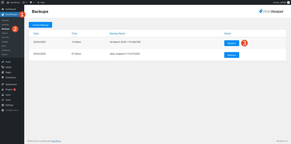 - Navigate to WordKeeper > Backups in your WordPress dashboard