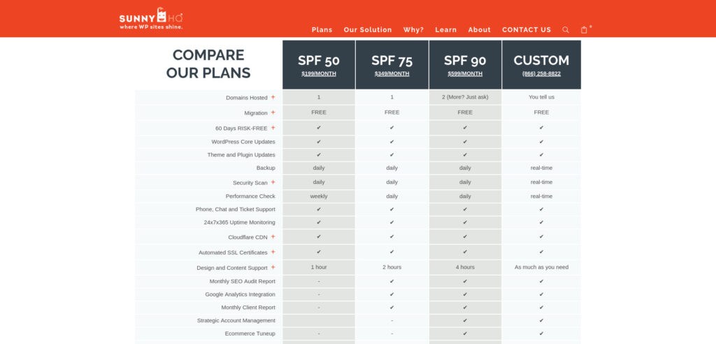 As far as pricing goes, managed hosting has a higher dollar price tag, but does save you at the very least a few hours every month. Sunny HQ’s managed WordPress hosting ranges from $199 to $599 per month, with a significant discount when paying annually.